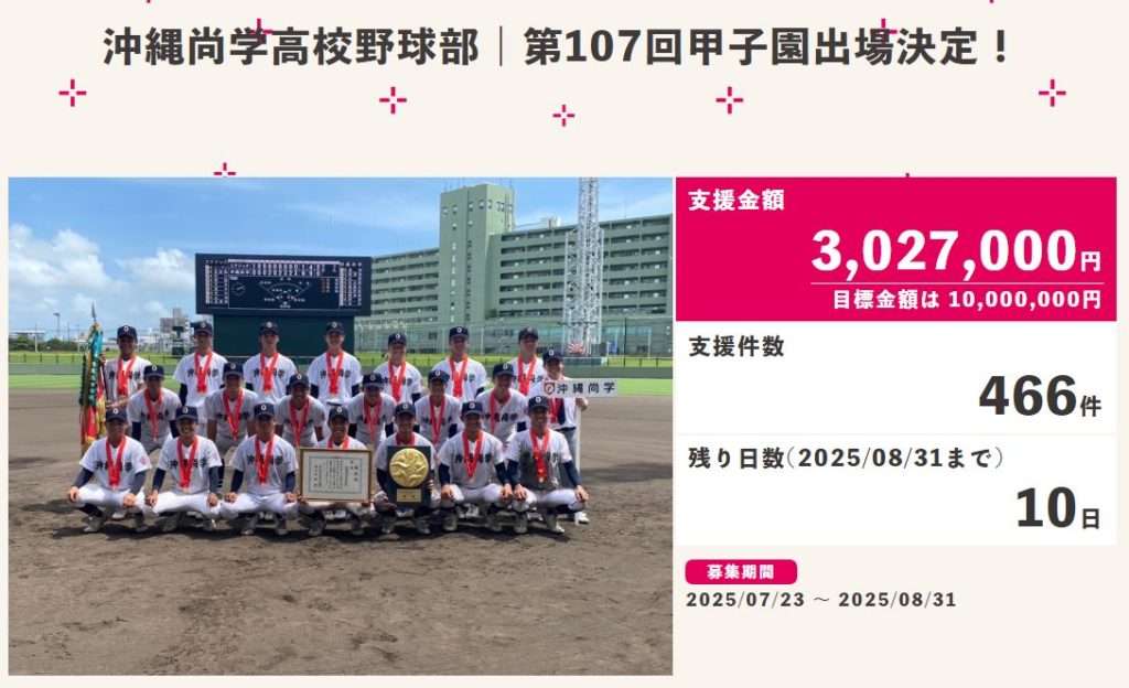 沖縄尚学高校野球部は、2025年の夏の甲子園で決勝進出を決めた後、遠征費や宿泊費などを支援するためにクラウドファンディングを実施していました。