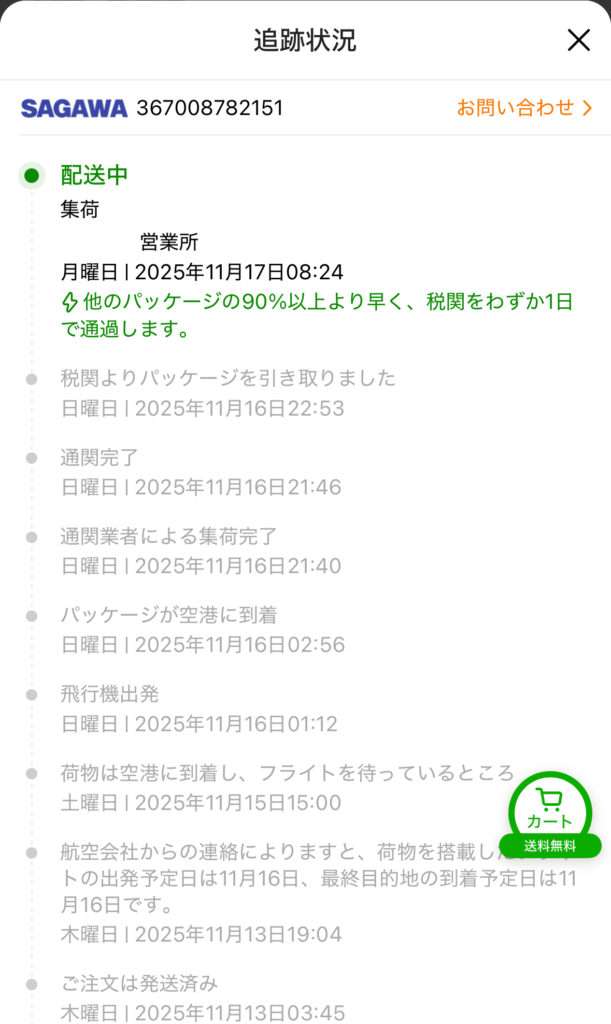 注文後は海外倉庫から発送され、日本到着後に国内の配送業者を通じて配達されます。